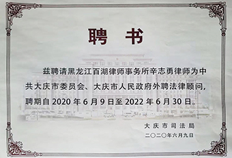 黑龙江百湖律师事务所自2011年组建以来,在辛志勇主任的带领下,百湖律师团队一直认真履行律师应尽的职责。在保障当事人合法权益的同时,积极为政府部门重大行政决策建言献策;对重大事项的合法性、政府合同的合法性进行审查;对疑难涉法的事务进行处理,受到了顾问单位的一致认可。百湖律所常年担任大庆市人力资源保障局、龙凤区人民政府等政府部门法律顾问,2019年正式进入黑龙江省高级人民法院破产管理人名录、大庆油田有限责任公司、中国石油天然气股份有限公司等下属单位律师库、黑龙江省政府服务类采购项目供应商。